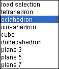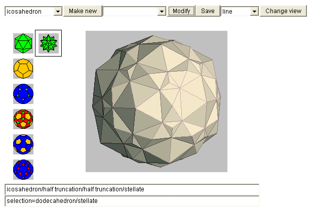 En él podemos seleccionar entre los cinco poliedros platónicos y los polígonos regulares de 3, 5 o 7 lados. Una vez realizada la selección presionamos el botón Make new (Hacer nuevo). También podemos cargar uno de los poliedros de ejemplo que vemos en la izquierda. En este caso en el menú desplegable marcaremos load selection. (Aquí aparecerán temporalmente las miniaturas de los que nosotros vayamos haciendo después de presionar el botón Save (Guardar).