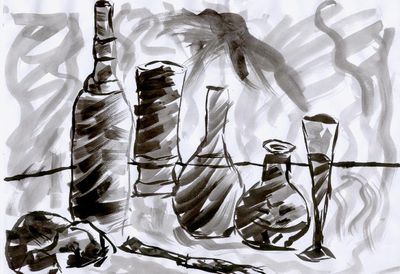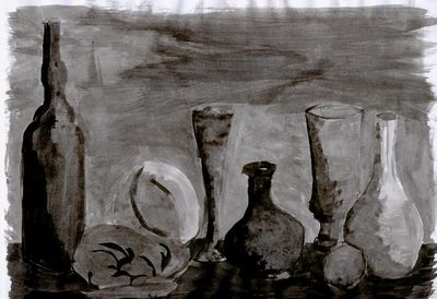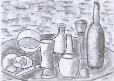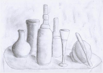 Primero decidiremos desde qué ángulo viene la luz para sombrear cada objeto del bodegón. Tendremos en cuenta la sombra que los objetos proyectan sobre otros y sobre la mesa o superficie en la que se apoyan.