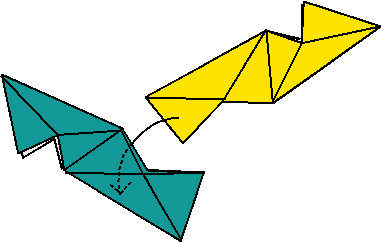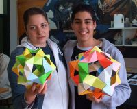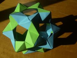 10.- Sigue añadiendo módulos fijándote en que cuando tengas cinco módulos alrededor de un hueco debes unirlos para formar un pentágono. Los picos de las pirámides coinciden con lo que serían los vértices de un dodecaedro. Se necesitan treinta unidades para conseguir esta figura. Una sugerencia es utilizar papeles DIN A4 del que obtendremos un cuadrado que a su vez dividiremos en 4 partes. De esta forma necesitaremos 8 papeles. Lo tendremos más fácil si utilizamos papeles cuadrados de los usados en los bloques para notas. Un reto es utilizar tres colores distintos de módulos y conseguir que en cada esquina se entrelacen siempre tres colores diferentes. |