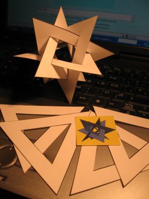 Calcular el tamaño de los huecos en relación al grosor del material usado, y al ángulo que giran las caras no es fácil. Para el diseño de las maquetas, he utilizado una aplicación en Java que puedes encontrar en la página de George Hart. En ella puedes encontrar más información sobre este tema y algunas figuras construidas con distintos materiales. |