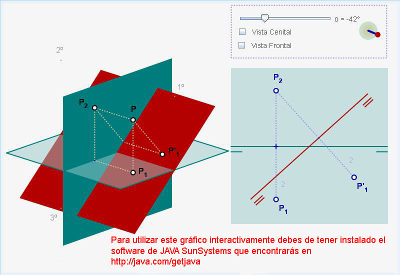 Mueve el punto rojo como si fuera un joystick para girar el gráfico en 3D. Utiliza el cursor para variar el ángulo a (ángulo que forma el nuevo plano horizontal con el viejo) . También podemos variar las proyecciones del punto para ver distintas apariencias según la posición del punto.