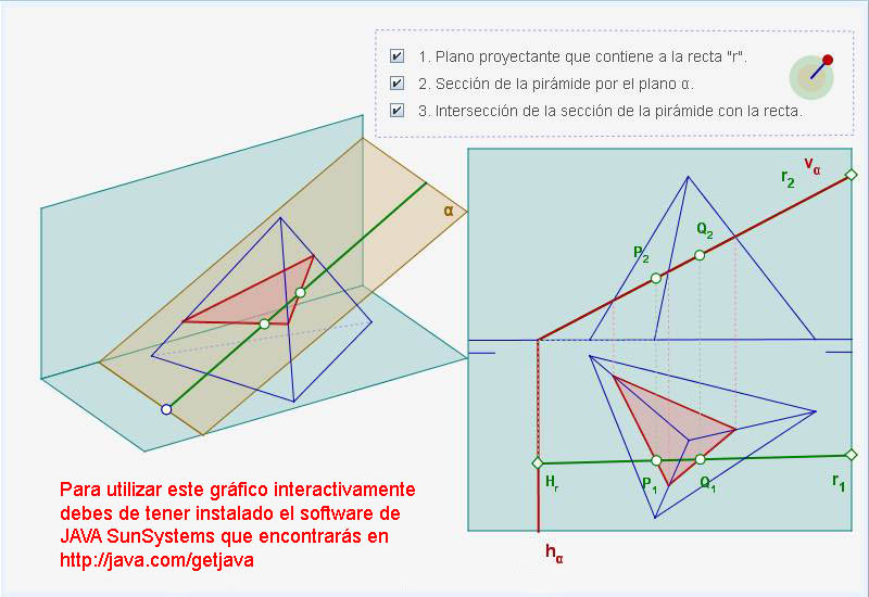 Mueve el punto rojo como si fuera un joystick para girar el gráfico en 3D. Cambia la posición de la recta moviendo sus proyecciones o los extremos de éstas con forma de rombo. También puedes variar las proyecciones de los vértices de la pirámide para ver distintas posibilidades (los vértices de la base deben de mantener el mismo orden).