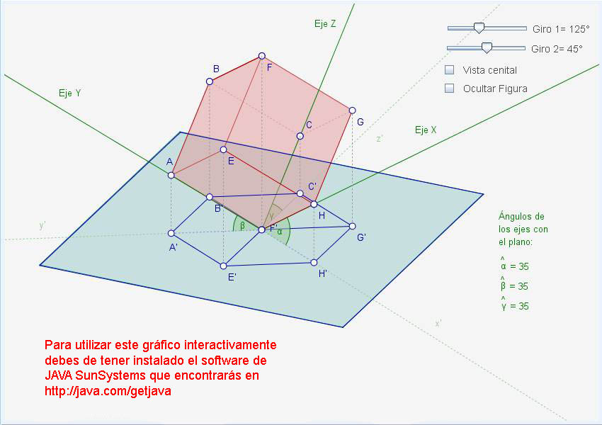 Utiliza en el gráfico los cursores "Giro 1" para girar la figura respecto al eje horizontal del plano y "Giro 2" para girarla respecto al eje vertical. Comprueba los diferentes ángulos que pueden formar los ejes y, marcando la casilla "Vista Cenital", la perspectiva resultante.